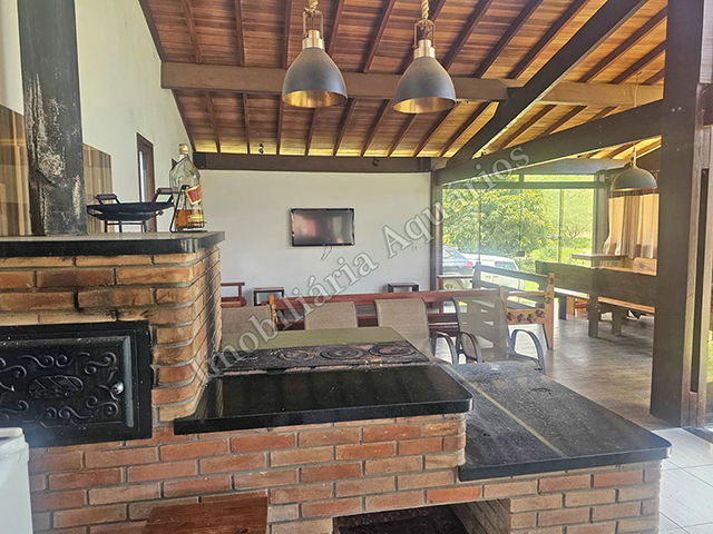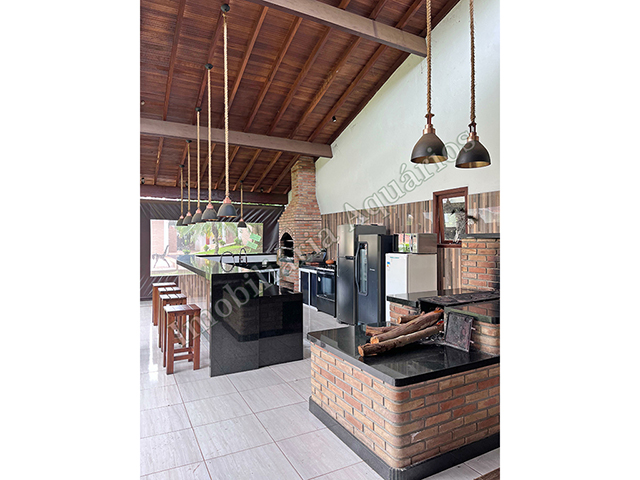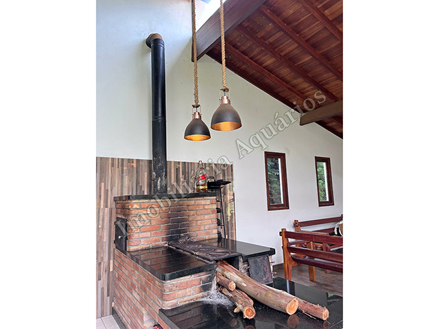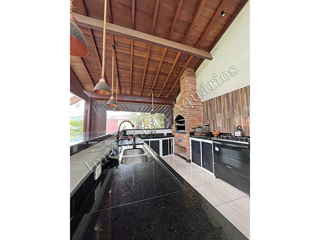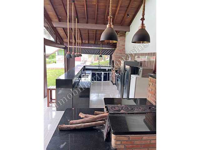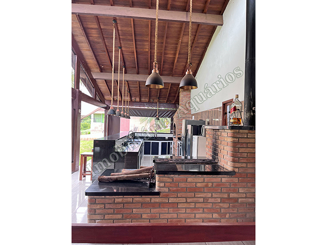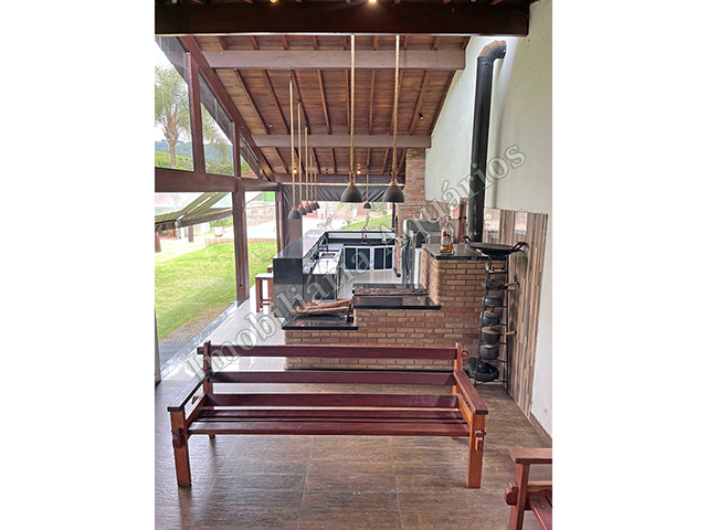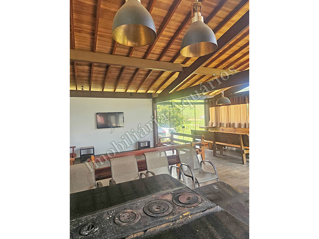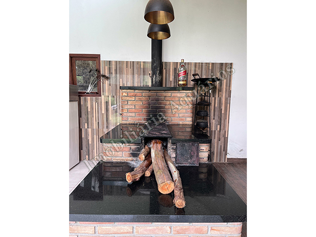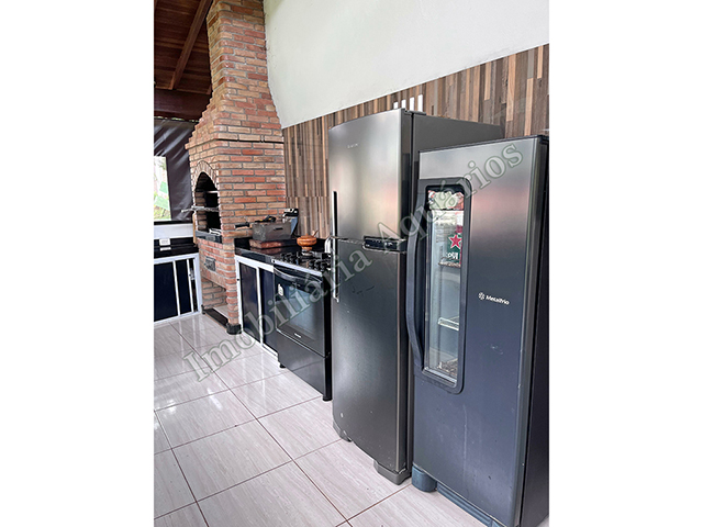 Possui área gourmet com sala de jantar equipada com fogão e forno a lenha, churrasqueira, cervejeira, freezer, geladeira e microondas.