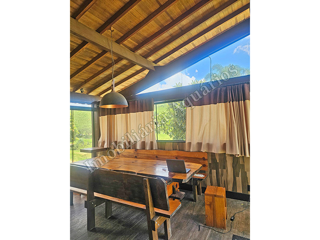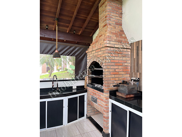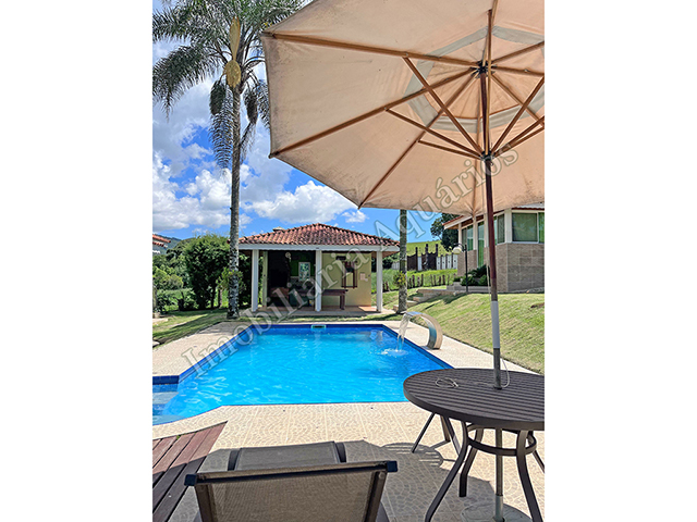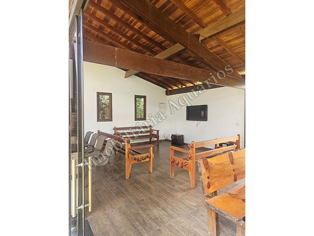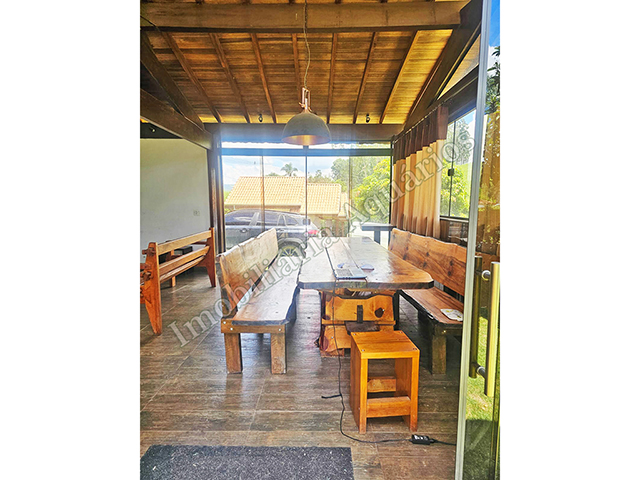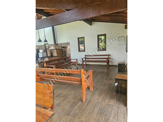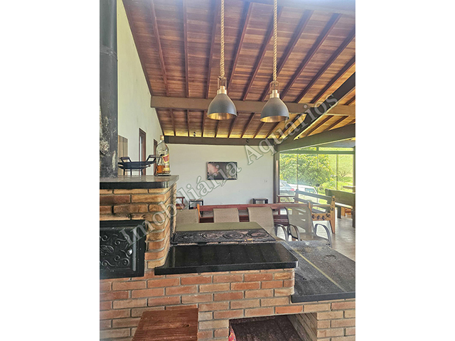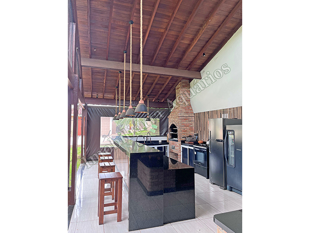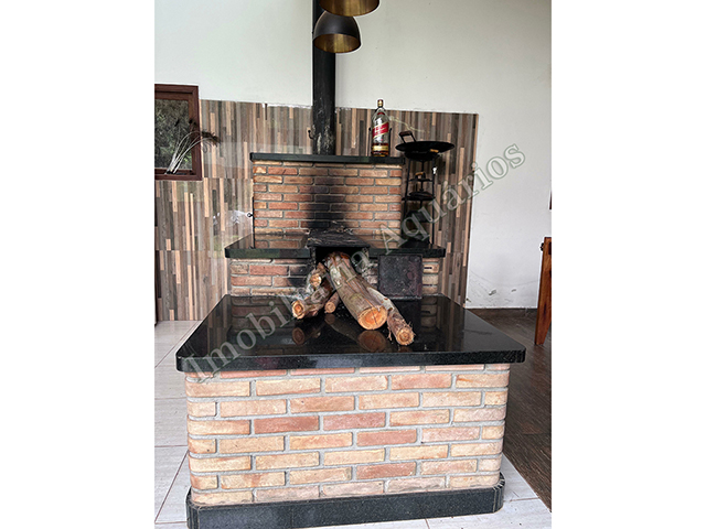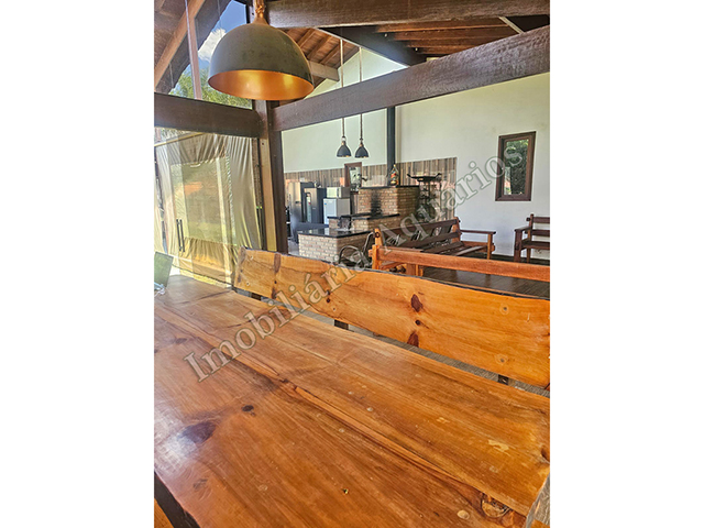 Possui área gourmet com sala de jantar equipada com fogão e forno a lenha, churrasqueira, cervejeira, freezer, geladeira e microondas.